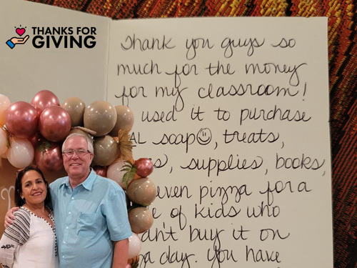 Sarah shares, “We live in Tennessee in a very poor county where many children are being raised by a family member other than a parent. We believe education, especially at a very young age, is important, and no child should have to go to school without the supplies they need. So, we help by donating money to two McNairy County elementary school classes. The teachers use it to buy needed supplies – everything from pencils and notebooks, soap for the classroom, prizes, and even pizza for kids who didn’t have money for pizza day. The teachers distribute the supplies to those in need without making a big deal of it, so the kids aren’t singled-out for not having something. We are blessed to be able to help where we can.”